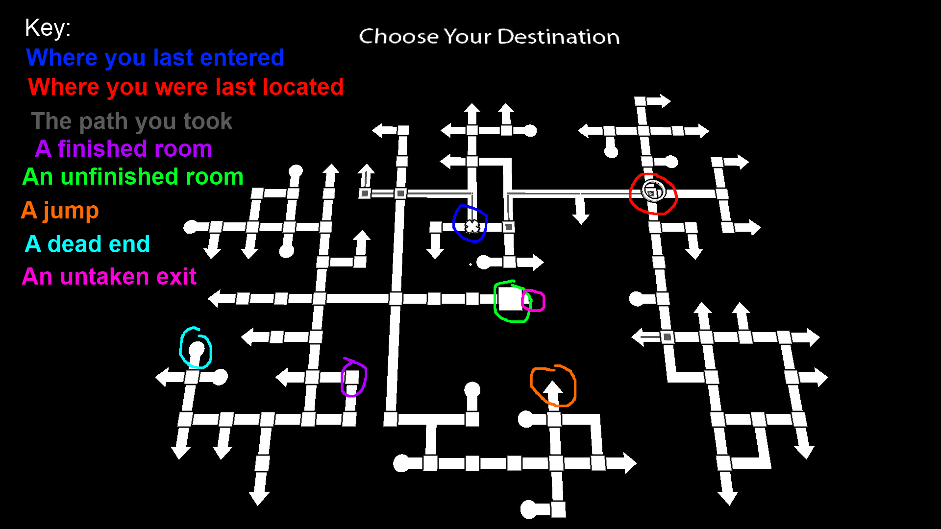While looking at the map, short rectangles not connected to an arrow or a bubble denote an untaken path. Bubbles show dead ends, such as set pieces or other places the player cannot progress from except by leaving via the Main Hub. Arrows show paths that connect to other puzzles.